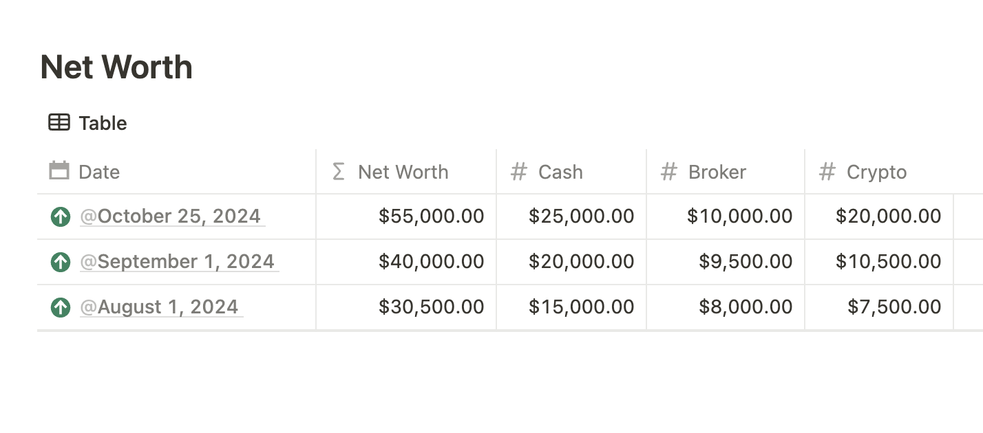 Tracking your net worth can be eye-opening. By logging your cash, stocks, and cryptocurrencies in Notion, you'll see your financial trajectory—whether it's rising or falling. The process is simple: record your assets at each month's end and watch the changes over time. You can customize the template to include more accounts or assets and even use different currencies if needed. This creates a comprehensive snapshot of your financial health.