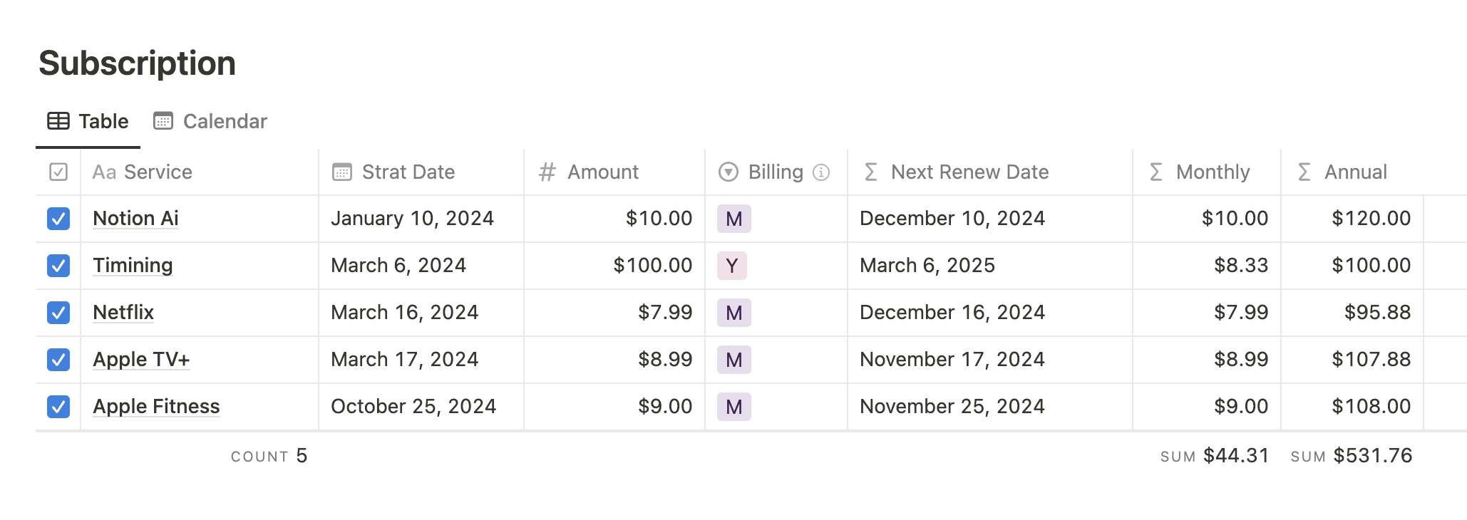 Subscriptions can quickly add up, but Notion's calendar view helps you track renewal dates and avoid unexpected charges. Simply enter your subscription details—such as cost and renewal frequency—and Notion calculates your monthly or yearly spending. This streamlines budget management and planning. For an in-depth explanation of this system, you can watch my How to Use Notion Calendar (For Beginners) video.
